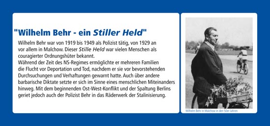 Wilhelm Behr war von 1919 bis 1949 als Polizist tätig, von 1929 an vor allem in Malchow. Dieser Stille Held war vielen Menschen als couragierter Ordnungshüter bekannt. Während der Zeit des NS-Regimes ermöglichte er mehreren Familien die Flucht vor Deportation und Tod, nachdem er sie vor bevorstehenden Durchsuchungen und Verhaftungen gewarnt hatte. Auch über andere barbarische Diktate setzte er sich im Sinne eines menschlichen Miteinanders hinweg. Mit dem beginnenden Ost-West-Konflikt und der Spaltung Berlins geriet jedoch auch der Polizist Behr in das Räderwerk der Stalinisierung.