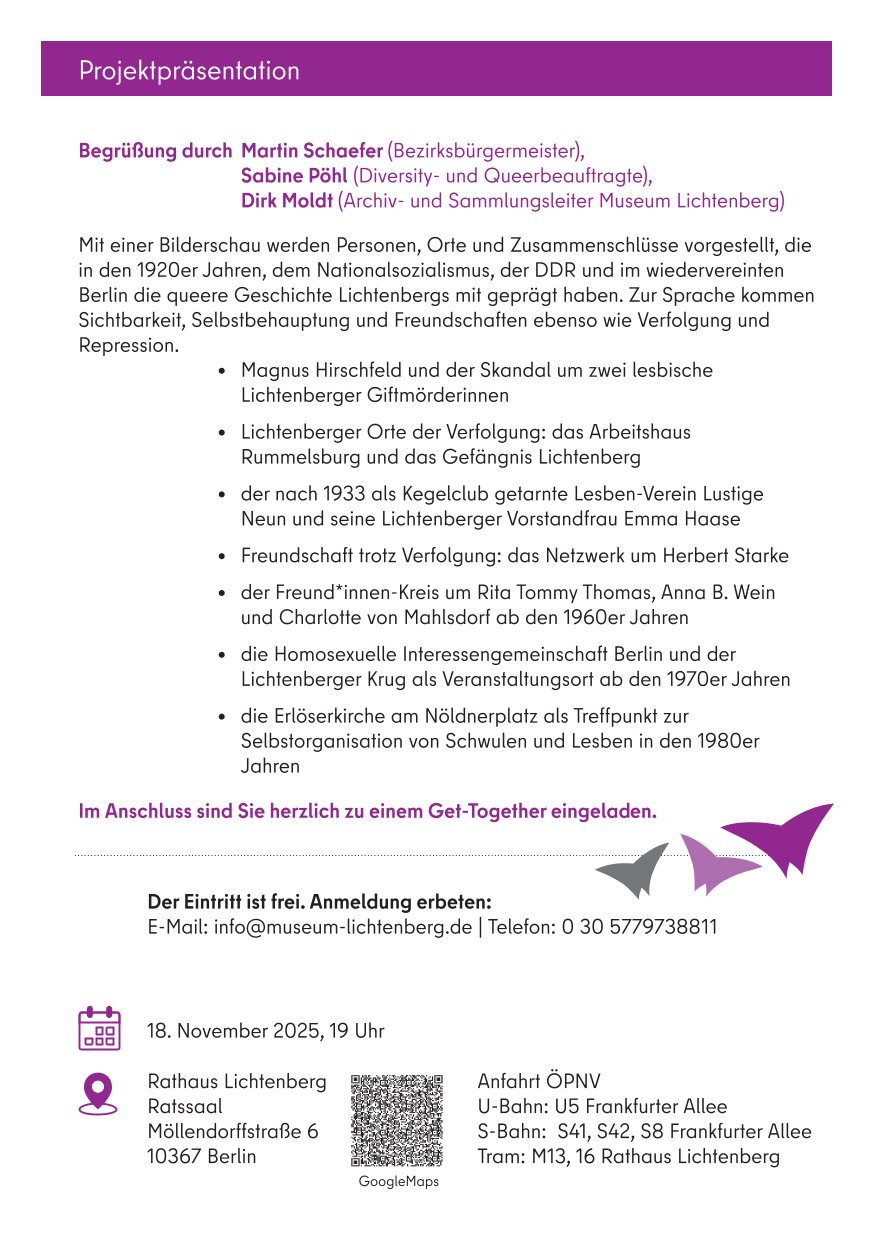 Zur Projektpräsentation der Ergebnisse des Recherche- und Vermittlungsprojekts Queer Lichtenberg - gestern und heute laden die Diversity- und Queerbeauftrage sowie das Museum Lichtenberg herzlich bei freiem Eintritt ein.