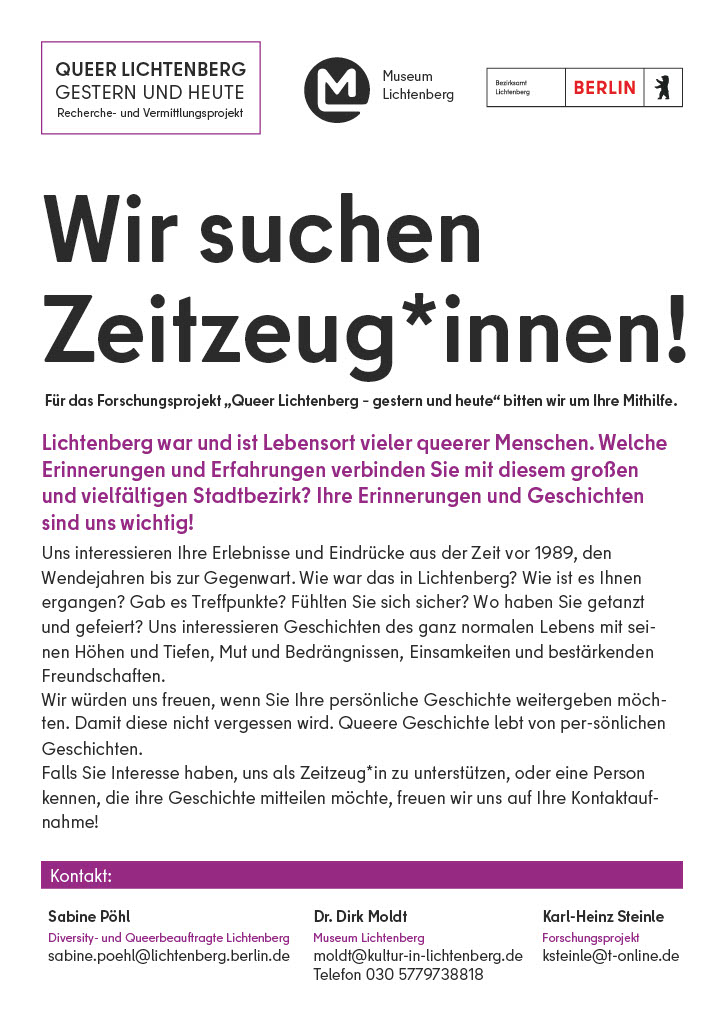 Für das Forschungsprojekt "Queer Lichtenberg - gestern und heute" bitten wir um Mithilfe.