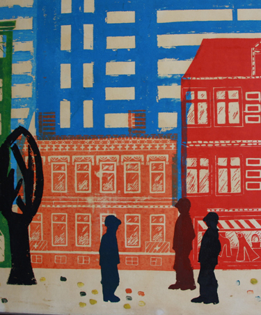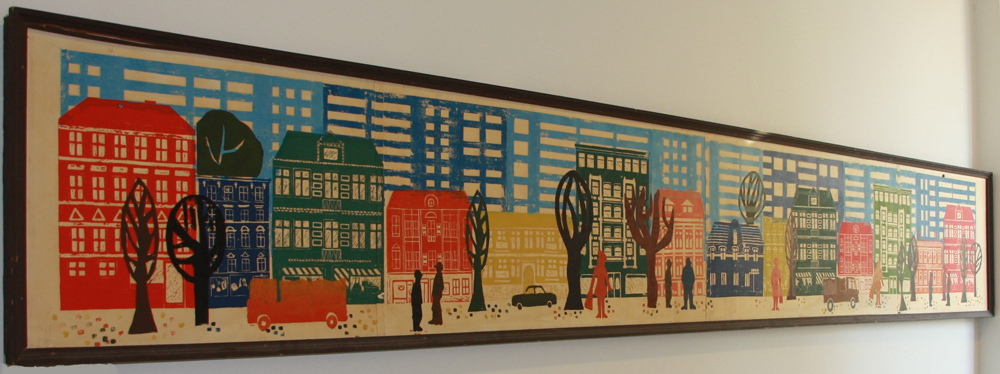 Im Depot unseres Museums befindet sich ein langes, gerahmtes Bild aus übereinandergelegten Farbdrucken. Es stellt eine doppelte Häuserzeile mit Bäumen dar, vor der sich Menschen und Fahrzeuge bewegen. Die Anordnung der Bildelemente lässt die Vermutung zu, dass es sich um eine Darstellung der zwischen 1979 und 1984 sanierte Straße der Befreiung (heute Alt-Friedrichsfelde) handelt.