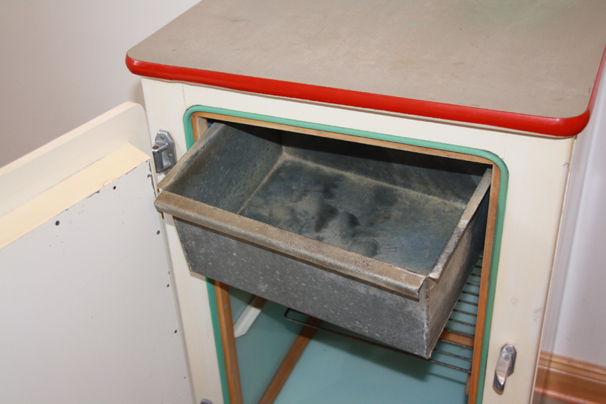 Dieser aus einem Lichtenberger Haushalt stammende Eisschrank mit Sprelacard-Platte wurde nach 1955 hergestellt und bis in die 1960er Jahre verwendet, wie uns die Spenderin, Frau Brand, bei der Übergabe sagte. Eisschränke wurden seit ca. 1900 in Haushalten verwendet. Kühlschränke mit einem elektrischen Aggregat hielten erst in den 1950er Jahren in europäische Haushalte Einzug. Im Inneren sieht er bereits wie ein richtiger Kühlschrank aus, bis auf die Zink-Wanne im obersten Fach, die das kühlende Eis aufnahm. Die kalte Luft sank nach unten und hielt den Innenraum des Schranks konstant bei niedrigen Temperaturen.
