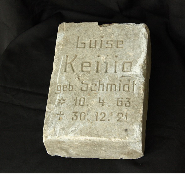 Zu den schon älteren Exponaten unseres Museums zählt der erst vor kurzem in die Sammlung aufgenommene Grabstein von Luise Keilig, geborene Schmidt, die vom 10. April 1863 bis zum 13. Dezember 1921 gelebt hat. Aufmerksame Straßenbauarbeiter fanden den Stein bei Ausschachtungsarbeiten am 6. Juli dieses Jahres im Unterbau der Kreuzung Möllendorff- / Ecke Rutnikstraße und informierten das Museum über den Fund.