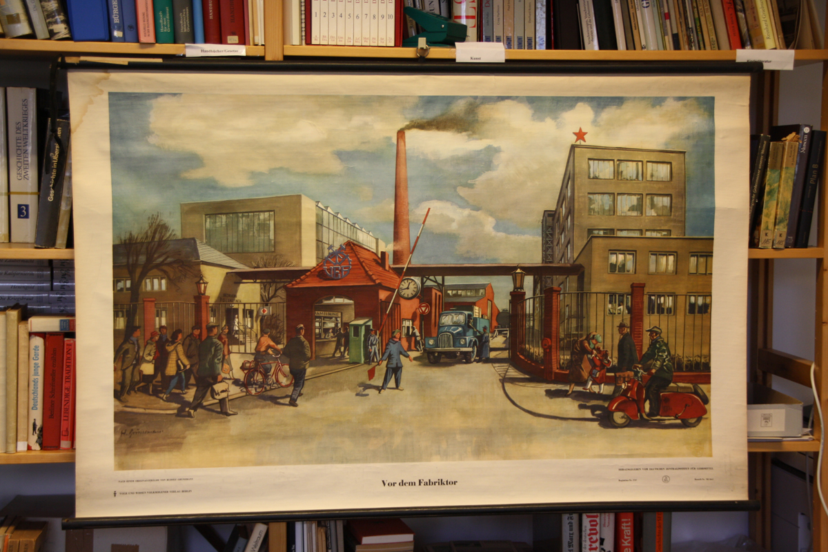Das 1950 gegründete Deutsche Zentralinstitut für Lehrmittel (DLZ), produzierte gemeinsam mit dem Verlag Volk und Welt Karten für den Schulgebrauch. Die Karte „Vor dem Fabriktor“ aus dem Jahr 1957 war dazu gedacht, den Kindern ein anschauliches Bild von der Lebenswelt der Werktätigen zu vermitteln und gibt die idealtypische Ansicht einer Toreinfahrt in einen sozialistischen Betrieb wieder. Arbeit war ein wichtiges Thema in der DDR, durch sie sollten sich die vom Arbeitskollektiv geformten Menschen definieren. Dementsprechend zeigt das im realistischen Stil gemalte Bild Alltagssituationen vor dem Tor, wie einen Schichtwechsel, eine Kontrolle an der Pförtnerloge und Verkehrsregulierung durch einen Fabrikarbeiter. Viele kleine Szenen waren dazu gedacht, entdeckt zu werden – auf Kosten einer exakten perspektivischen Darstellung. Der Rote Stern auf dem Dach eines der Gebäude weist auf die Produktionsverhältnisse, die gekreuzten Hämmer im Emblem auf dem Dach des Pförtnerhauses bedeuten, dass es sich um einen Bergbaubetrieb handelt. Als Sinnbild für eine gute Wirtschaftsentwicklung steht der rauchende Schornstein und die Betriebspoliklinik weist auf die sozialpolitischen Maßnahmen des, wie sich die DDR nannte, Arbeiter- und Bauernstaats.