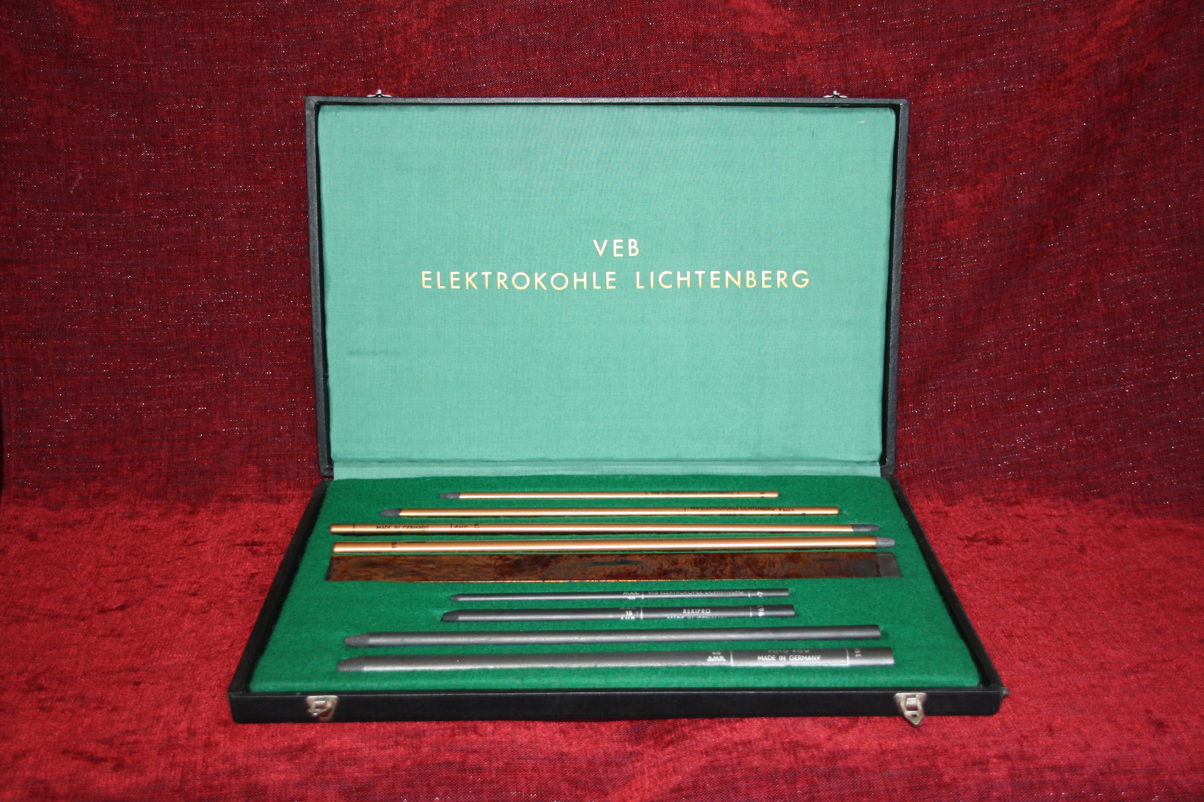 Unter den Zahlreichen Hinterlassenschaften des ehemaligen VEB Elektrokohle, Dokumente, Fotografien, Pläne, Repräsentationsmappen und andere Kleingegenstände, befinden sich auch mehrere Musterkästen, die für Messen hergestellt wurden, wie dieser aus dem Jahr 1967.