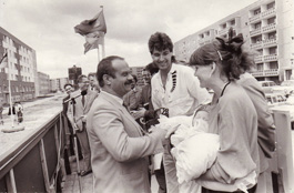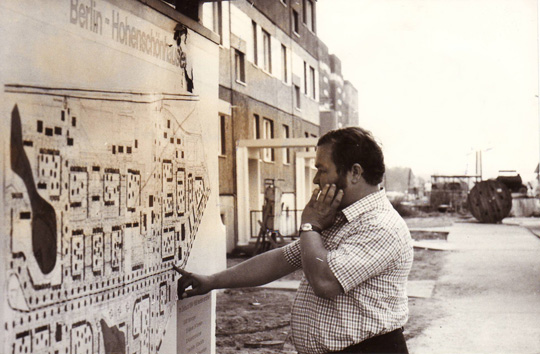 | Baubeginn (Archiv Museum Lichtenberg) | Übergabe der 4.300 Wohnung in der Criwitzer Str. 14 an Familie Roth durch Bezirksbürgermeister Wilfried Franke (Archiv Museum Lichtenberg) |