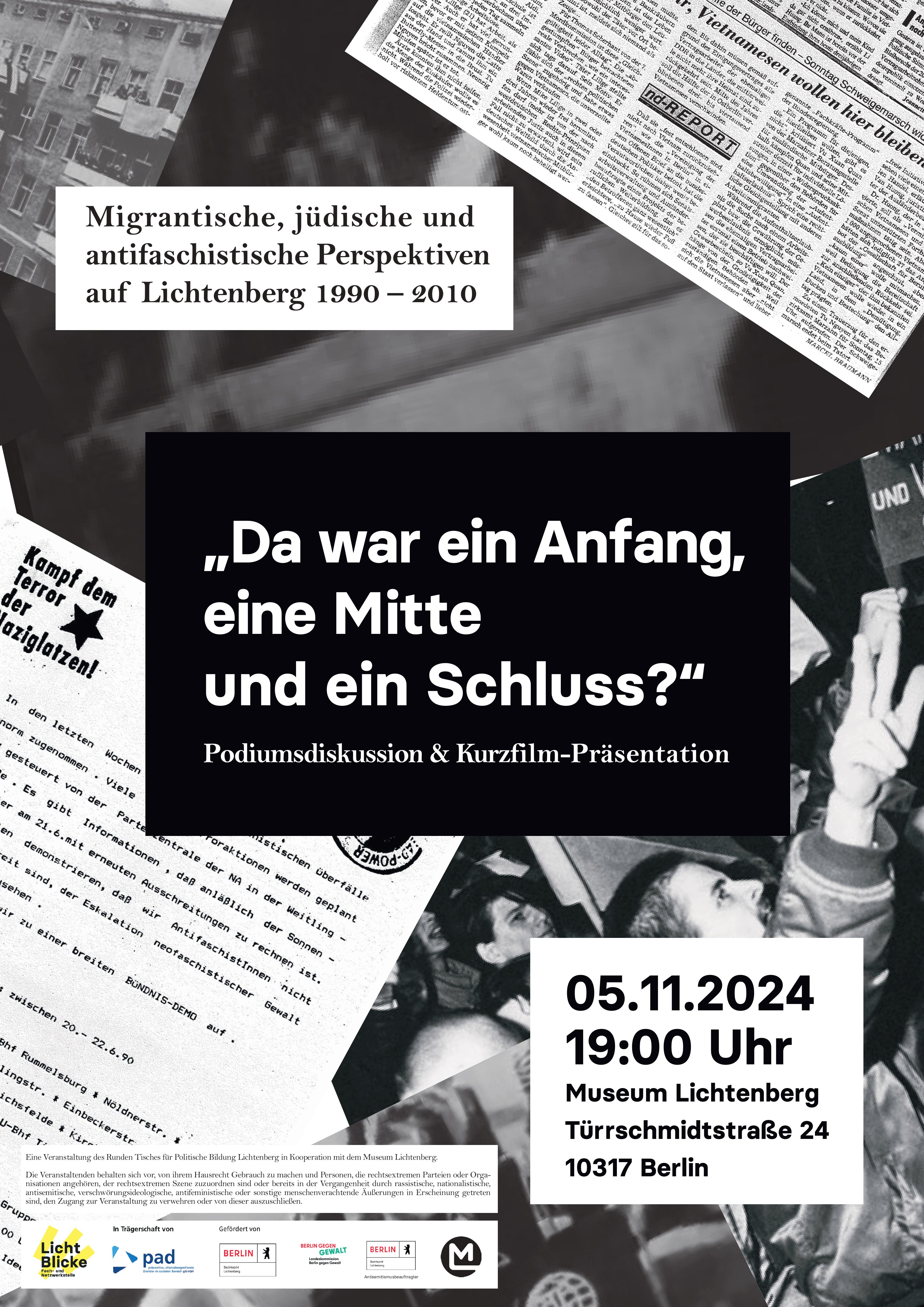 Wie Aktivist*innen und Betroffene damals mit diesem bedrohlichen Klima umgingen, schildert der Kurzfilm „Da war ein Anfang, eine Mitte und ein Schluss?“. Die Dokumentation, die im Auftrag des Runden Tisches für politische Bildung Lichtenberg entstanden ist, wird am 5. November erstmals öffentlich gezeigt. Im Anschluss an die Premiere werden die beteiligten Protagonist*innen über ihre Erinnerungen an die Zeit in Lichtenberg sprechen und ihre Erfahrungen im Hinblick auf deutsch-deutsche Kontinuitäten von Rassismus und Antisemitismus sowie in Bezug auf die heutige Situation diskutieren.