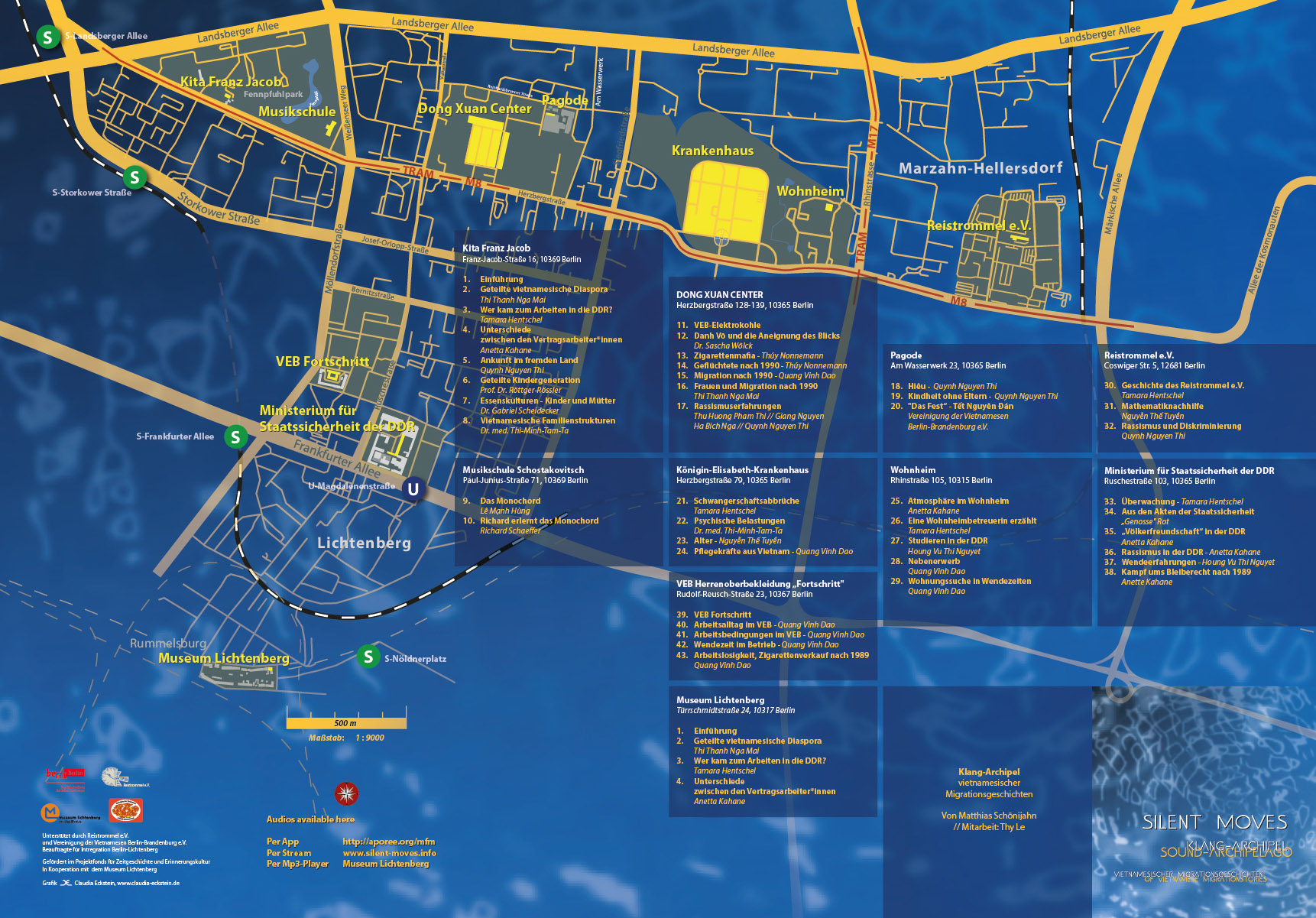 Nirgendwo sonst in Deutschland sind so viele Geschichten und Gegenwarten vietnamesischer Migration mit konkreten Orten verbunden wie in Berlin-Lichtenberg. Silent Moves setzt O-Töne, Interviews, Akten des Ministeriums fĂŒr Staatssicherheit und Musik zu einem akustischen Archipel zusammen und fĂŒhrt zu Orten vietnamesischen Lebens von der DDR bis zur Gegenwart. So wird das Bezirksgebiet zu einem begehbaren Audioarchiv aus Stimmen von Zeitzeug*innen der âerstenâ und âzweiten Generationâ, Ethnolog*innen, Psychiater*innen, Menschenrechtsaktivist*innen, Musiker*innen. Die Hörer*innen sind eingeladen, die akustischen Spuren aufzunehmen und den bewegenden Geschichten vietnamesischer Migrant*innen in Berlin zu folgen.