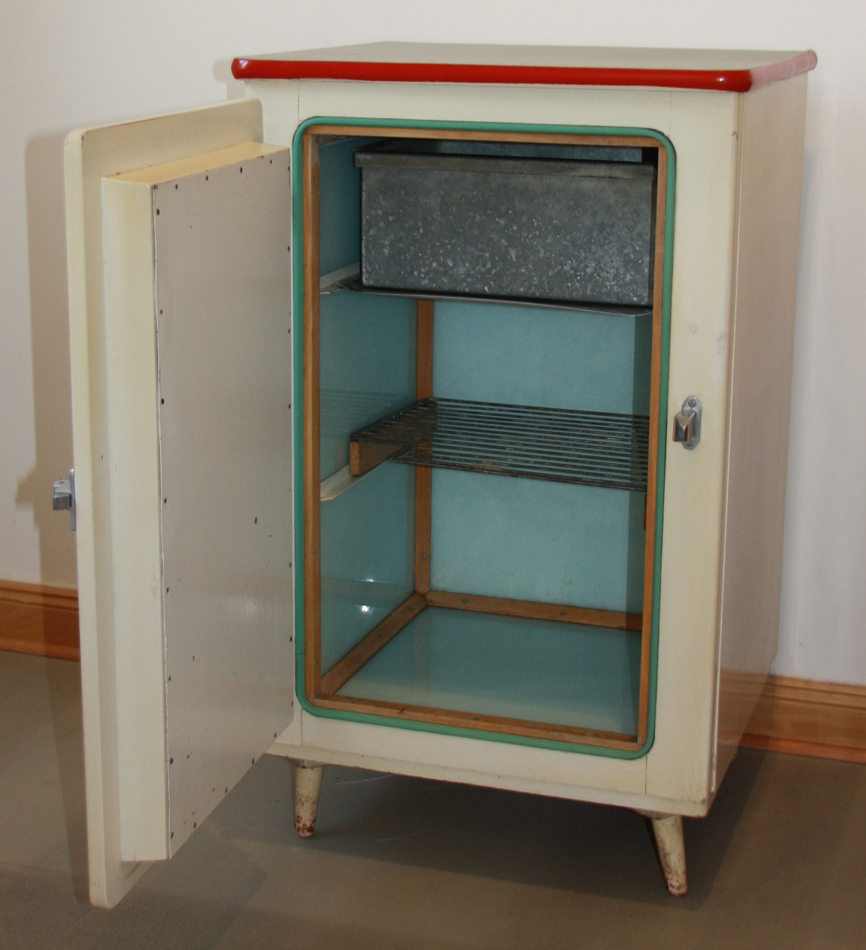 Dieser aus einem Lichtenberger Haushalt stammende Eisschrank mit Sprelacard-Platte wurde nach 1955 hergestellt und bis in die 1960er Jahre verwendet, wie uns die Spenderin, Frau Brand, bei der Übergabe sagte. Eisschränke wurden seit ca. 1900 in Haushalten verwendet. Kühlschränke mit einem elektrischen Aggregat hielten erst in den 1950er Jahren in europäische Haushalte Einzug. Im Inneren sieht er bereits wie ein richtiger Kühlschrank aus, bis auf die Zink-Wanne im obersten Fach, die das kühlende Eis aufnahm. Die kalte Luft sank nach unten und hielt den Innenraum des Schranks konstant bei niedrigen Temperaturen.