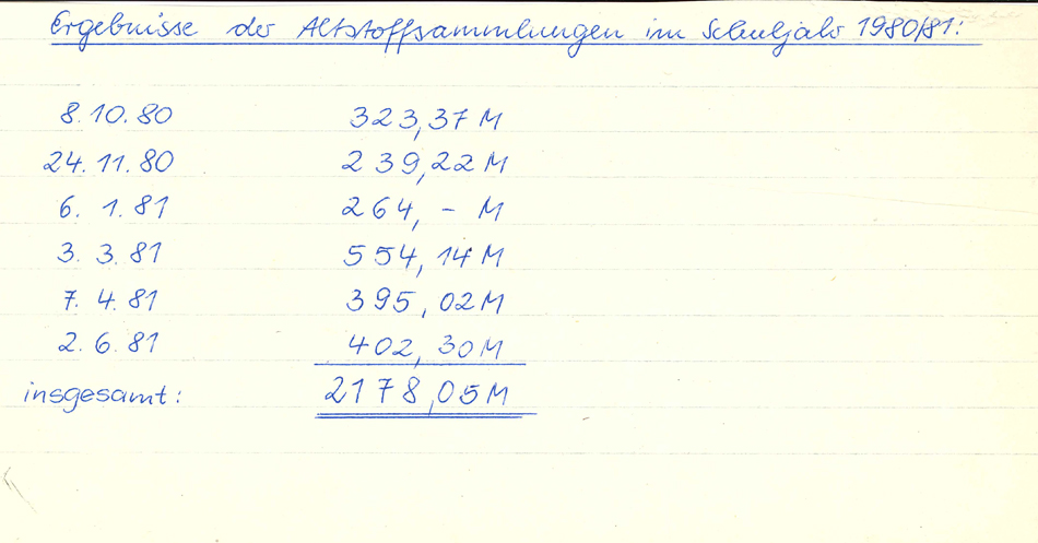 Die DDR als an Rohstoffen armes Land war auf diese – heute Wertstoffe genannten – Materialien angewiesen. Zum Ende der DDR beschäftigte das SERO-Recycling-System etwa 29.000 Menschen. Die Annahmestellen wurden häufig gewerblich und nebenberuflich betrieben. Von ihnen aus gingen die Rohstoffe zur Wiederaufbereitung in Glaswerken, Papierfabriken, Metallschmelzen und Textilmühlen. In einem dichten Netz von Annahmestellen konnten zu einem erstaunlich hohen Preis Altstoffe abgegeben werde. Ein Kilogramm Zeitungspapier oder Wellpappe brachte, ebenso wie ausgewiesene Weißglasflachen, 30 Pfennige in das Portemonnaie, eine leere Spraydose 10 Pfennige. Das war nicht nur für die Sammler, sondern auch für die DDR-Wirtschaft ganz offenbar ein lohnendes Geschäft. 1989 konnten mit der Erfassung und Wiederverwertung von Sekundärrohstoffen und damit durch das Vermeiden von teuren Materialeinfuhren 3 Milliarden DDR-Mark eingespart werden. Das Bild unten zeigt die Bilanz der Altstoffsammlung der Robert-Uhrig-Schule 1980-81.