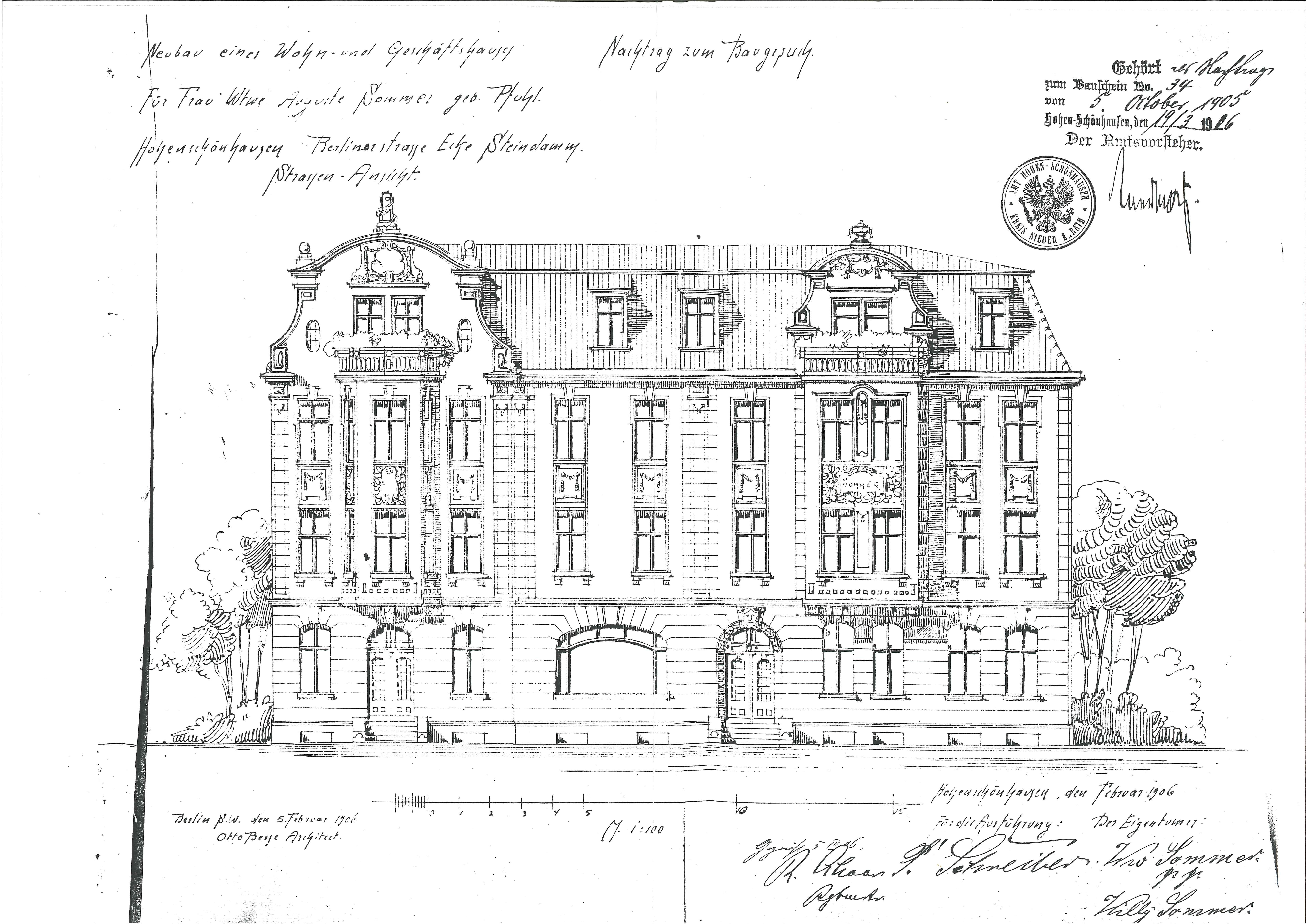 Die Parzellierung des Hohenschönhauser Rittergutes, die Pflasterung von Gehwegen, die Errichtung einer StraĂenbahnverbindung nach Berlin, sowie die Errichtung der Löwenbrauerei trugen dazu bei, dass entlang des Orankesees fĂŒr Bankiers, Kaufleute und andere Unternehmer LandhĂ€user und entlang der heutigen Konrad-Wolf-StraĂe (damals Berliner StraĂe) prĂ€chtige BĂŒrgerhĂ€user entstanden. Zu diesen BĂŒrgerhĂ€usern gehört auch das hier auf dem GemĂ€lde abgebildete Wohnhaus mit GaststĂ€tte in der Konrad-Wolf-StraĂe 145. Es wurde 1905/06 entsprechend den WĂŒnschen der Bauherrin Witwe Sommer durch Paul Schreiber und seine Firma errichtet. Der Bau- und Zimmermeister baute entlang der Konrad-Wolf-StraĂe (frĂŒher Berliner StraĂe) weitere, noch heute erhalten gebliebene, prĂ€chtige WohnhĂ€user. Auch fĂŒr den Bau der Zuckerwarenfabrik in der Konrad-Wolf-StraĂe 83-84 und der einstigen Dorfschule in der HauptstraĂe war er zustĂ€ndig.