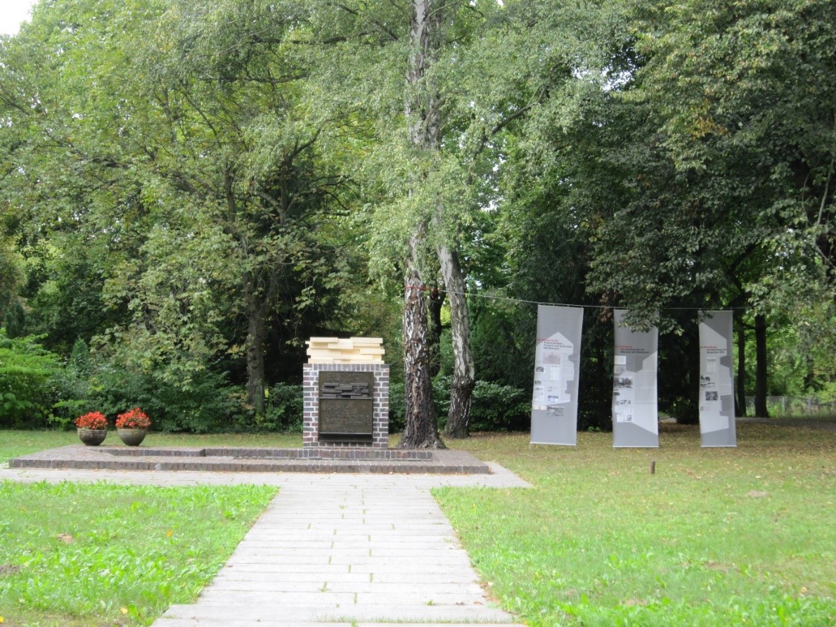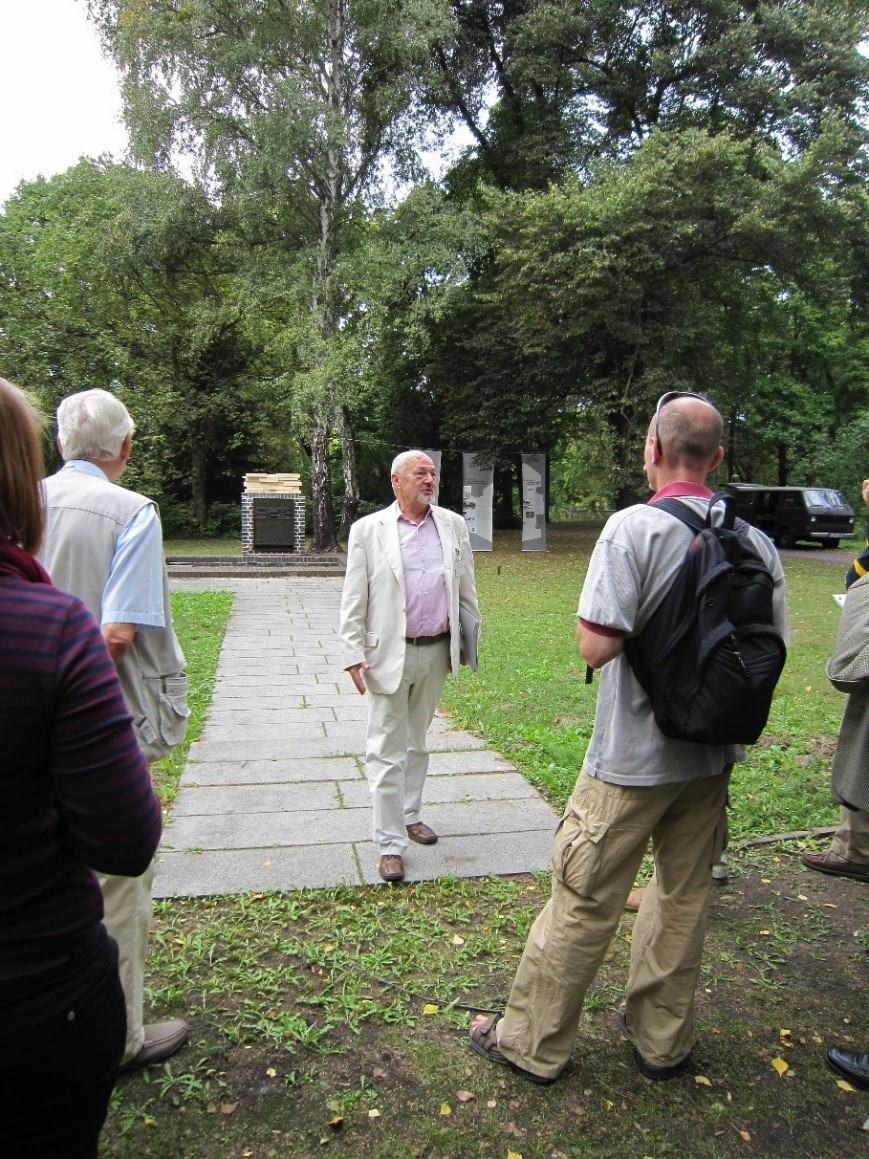 Prof. Jürgen Hofmann vom Förderkreis Erinnerungsstätte der deutschen Arbeiterbewegung Berlin-Friedrichsfelde e.V. führte die Besucher*innen an den ehemaligen Standort des 1935 geschleiften Denkmals. Ganz dem Motto des Denkmaltages 2013 entsprechend kann das vom letzten Bauhausdirektor Ludwig Mies van der Rohe entworfene Revolutionsdenkmal als ein unbequemes Denkmal sowohl in der Zeit seiner Entstehung, seiner Vernichtung als auch in seiner Nachwirkung betrachtet werden. Heute erinnert ein „Denkmal für ein Denkmal“ von Günter Stahn und Gerhard Thieme an seinen ehemaligen Standort. Jürgen Hofmann informierte vor Ort über die Entstehungsgeschichte und die der Zerstörung des im Auftrage der KPD 1926 von Ludwig Mies van der Rohe errichteten Denkmals für Rosa Luxemburg, Karl Liebknecht und weiterer Revolutionsopfer der Januarkämpfe 1919. Jürgen Hofmann ist auch Autor des in der Reihe „Die Neuen Architekturführer“ mit dem Titel „Zentralfriedhof Friedrichsfelde Berlin“ im Stadtwandel Verlag erschienenen Bandes 91.